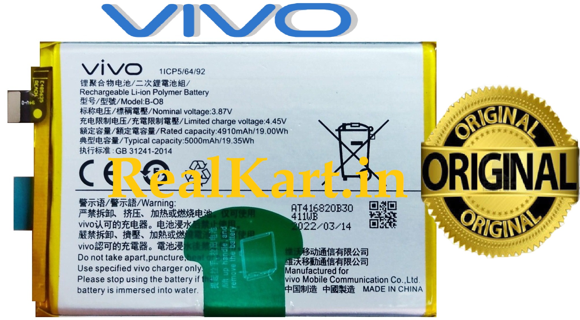 100% Original Brand New Vivo B-O8 Battery For Vivo Y52s V2057A / Vivo Y31 (2021) V2036 / Vivo Y51 (2020) V2030 B-O8 – 5000mAh with 6 months warranty.