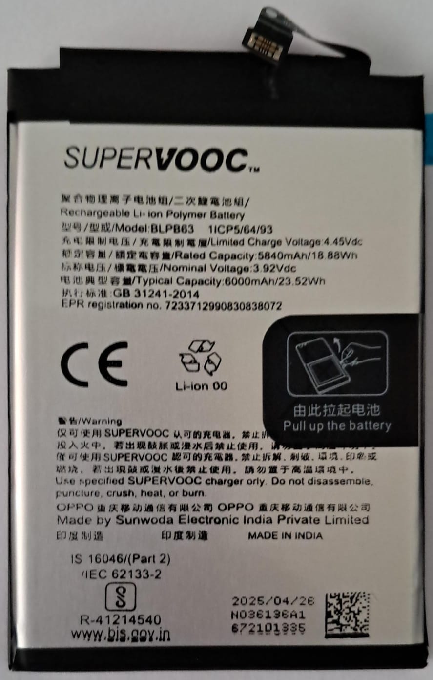 100% Origjnal Brand New OPPO A5 Pro 5G (CPH2695) Supervooc BLPB63 5800mAh Battery 6 months warranty.